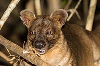 Prachtige close up opname van de zeldzame katachtige Fossa in het binnenland van Madagaskar in de nacht