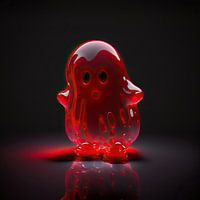 Foto Shiny Baby Ghost - Dit kunstwerk is een foto van een baby spookje in de stijl van een rode gummy beer. Het spookje is glanzend en reflecteert het licht op een prachtige manier. Het contrast met de zwarte achtergrond maakt het spookje nog meer opvallend.