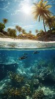 Foto Tropical Paradise - Dit kunstwerk is een prachtige foto van een tropisch paradijs. Boven het water zie je een weelderig eiland met grote palmbomen en een heldere blauwe lucht. Onder het wateroppervlak zie je een gedetailleerde getijdenpoel en koraalrif, met veel kleurrijke vissen en schelpen. Het licht dat door het water schijnt,…