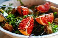 Deze salade valt meteen op. De gegrilde grapefruit staat centraal — knalrood, sappig en net een beetje gekarameliseerd langs de randen. Eromheen ligt een levendige mix van rucola, geroosterd brood en andere groene blaadjes, allemaal glanzend van een lichte dressing. De kleuren knallen eruit: felrood, diepgroen, goudbruin. De foto is…