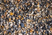 Het zijn vooral kokkels, op z'n kop en met de goede kant boven. In blauw, grijs, wit en oranje. Niet alles is scherp, de scherpte ligt in het midden van de foto, eromheen worden de schelpen steeds…