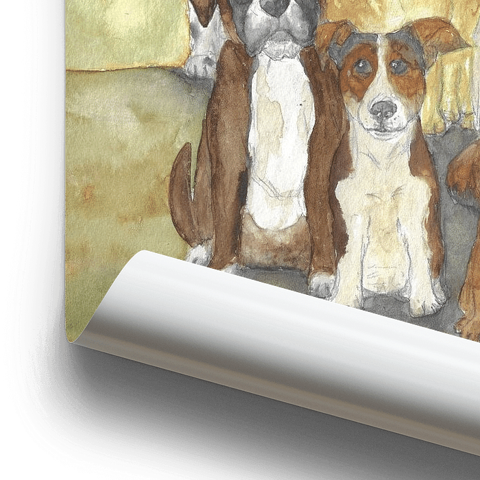 Deze schattige aquarel toont zestien verschillende hondenrassen die aandachtig naar de camera kijken, net als op een foto.
