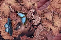 Koop dit vlinder werk Foto van Nigeriaanse Dame met Blauwe Vlinders in Herfstbladeren van Elianne van Turennout op canvas, aluminium dibond, (ingelijste) fotoprint, behang en ArtFrame, op maat geprint in Fine-Art kwaliteit.