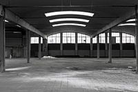 Foto van de verlaten markthallen in Meppel in zwart wit.