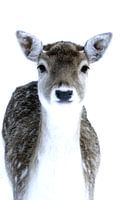 Foto van een hertje (hinde) in de sneeuw.