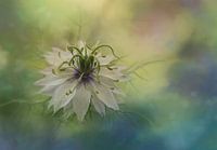 Foto van een witte Nigella bloem, zacht, dromerig en poëtisch van Joriali Fine Art