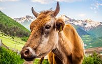 Een gelukkige koe met de besneeuwde toppen van de Kaukasus in Georgie op de achtergond bij zonsondergang.