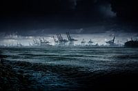 blauw, container, containerbrug, containerhaven, containerterminal, Duitsland, mistig, donker, Elbe, rivier, ijzig, grijs, haven, havenindustrie, Hamburg, herfst, herfstweer, koud, kil, landschap, landschapsformaat, bui, slecht, slecht weer, sneeuw, sneeuwbui, zeehaven, stroom, terminal, overzeese haven, overslaghaven, universele, universele haven, storm, verkeer, water, golven, weer, economie, bedrijfstak