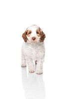 Een foto van een labradoodle puppy in studiosetting met een witte achtergrond. De puppy staat op een flexiplaat, waardoor zijn spiegelbeeld zichtbaar is.