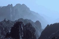Adembenemend dromerig berglandschap kort voor zonsopgang (blauwe uur). Silhouetten, nevel, mistige contouren in blauwtinten. Uitzichtpunt Huangshan (Huang Shan), bergmassief Gele Bergen, Yellow Mountains, Anhui, China. Mystieke droomwereld, bergwereld in ochtendsfeer en ochtendlicht. Blauwtonen variëren van ijsblauw naar lichtblauw,…
