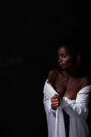 Foto van een bijna naakte, schaars geklede sexy meid tegen een donker zwarte achtergrond. Deze foto toont een vrouw met een diepe huidtint, gehuld in een loshangend wit overhemd tegen een donkere achtergrond. Het licht valt subtiel op haar gezicht, borsten en bovenlichaam, waardoor haar gelaatstrekken en de contouren van haar lichaam elegant worden benadrukt.