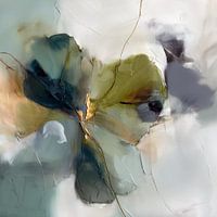 Abstract schilderij in groen,grijs en beige tinten met goud accenten.
