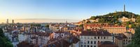 Het eerste licht valt op Fourvière heuvel, tijdens een zonsopkomst in de prachtige stad Lyon. Gezien vanaf Place Rouville in Croix-Rousse.