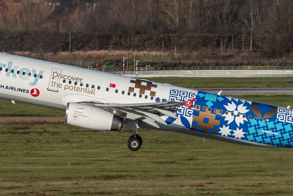 Een Airbus A321-200 van Turkish Airlines met speciaal kleurenschema "Turkey - Discover the potential" stijgt op van Flughafen Düsseldorf.