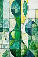 Een dynamisch abstract schilderij waarin strakke lijnen, lagen en kleurvlakken samenkomen tot een modern stedelijk landschap. De mix van diepe groentinten, turquoise, vergrijsd geel en zandkleurige accenten roept een gevoel op van architectuur, natuur en reflectie.