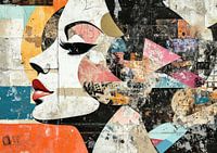 Fragmented Beauty - Dit vrouwen schilderij toont een abstract en veelkleurig portret van een vrouw, samengesteld met een mozaïek van geometrische en fragmentarische vormen, waarbij de grote charmante ogen en felrode lippen prominent naar voren komen.