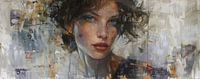 Fragmented Reality of Beauty - Dit vrouwen schilderij toont een jonge vrouw die direct de aandacht trekt met haar intense, lichtblauwe ogen en een blik die doordringt. Haar rommelige, donkere haar contrasteert prachtig tegen haar lichte huid. Het portret is verweven met abstracte elementen: kleurrijke en gefragmenteerde texturen en vormen die de achtergrond vullen. Deze achtergrond lijkt een stedelijke collage van willekeurige woorden, tekens en vegen, bestaande uit bruintinten, grijstinten, blauwaccenten en gele vlekken. Deze chaotische compositie omlijst haar gestalte, waardoor de levendigheid van haar aanwezigheid nog meer wordt geaccentueerd. Het schilderij gebruikt een mix van realisme vermengd met abstracte, expressionistische elementen, creërend een dynamische en moderne uitdrukking.