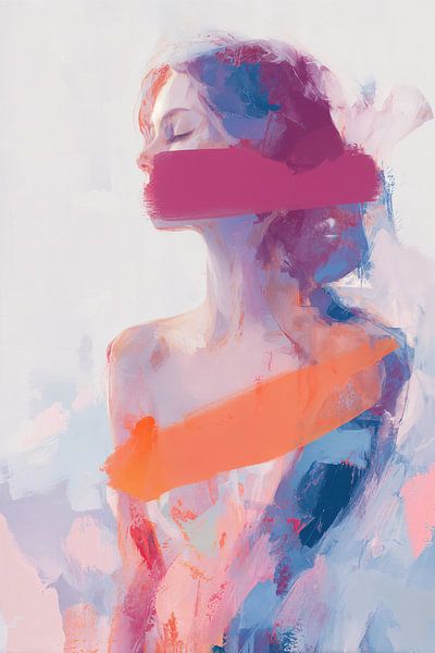 Een portret waar kleur de stem is en stilte spreekt volumes. Dit schilderwerk vloeit voorbij in zachte lagen paars, roze en blauw, waarbij abstracte pensaelstreken een vrouw omwikkelen in een droom van gemengde gevoelens. Met gesloten ogen en een gezegeld mond voelt dit werk intens persoonlijk—een visueel manifest van innerlijke…