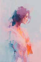 Een etherisch portret van een vrouwelijk profiel, waarin zachte aquareltinten van roze, blauw en oranje harmonisch samenvloeien. De vloeiende vormen creëren een meditatief beeld dat de grens tussen werkelijkheid en abstractie vervagen, met suggestieve penseelstreken die een gevoel van rust en introspectie uitstralen.