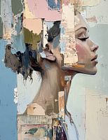 eigentijdse combinatie van abstractie en figuratieve kunst. Het zijprofiel van een vrouw vormt het centrale element, weergegeven met delicate details die haar kalmte en elegantie benadrukken. Haar gesloten ogen en ontspannen houding stralen introspectie en innerlijke rust uit. De zachte huidtinten worden omlijst door abstracte vlakken en ruwe penseelstreken in pastelkleuren zoals lichtblauw, roze, beige en een vleugje groen, die een dynamisch contrast bieden met de realistische weergave van het gezicht.