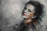 Het getoonde werk is een abstract, digitaal geschilderd portret in half profiel. De afbeelding combineert realistische gelaatstrekken met expressieve, grafische elementen zoals lijnen, arceringen, gekraste structuren en kleurspatten. Een gereduceerd kleurenpalet van grijze, zwarte en witte tinten wordt aangevuld met accenten in…