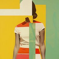 De vrouw is gedeeltelijk verborgen en lijkt bijna in de achtergrond op te lossen, wat een gevoel van mysterie en introspectie oproept. Haar silhouet is eenvoudig en elegant, zonder details in het gezicht, waardoor de nadruk ligt op de vorm en het kleurenpalet. De transparante en geometrische lagen voegen diepte toe en creëren een abstract, bijna futuristisch effect. Het gebruik van lijnen en vlakken geeft het werk een grafische, bijna digitale uitstraling die aansluit bij moderne kunststijlen.
