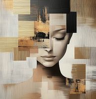 modern en intrigerend portret van een vrouw, opgebouwd uit een geometrische compositie van rechthoekige kleurvlakken in warme aardetinten zoals beige, bruin, en zwart. Het gezicht van de vrouw is zacht en gedetailleerd geschilderd, waarbij haar ogen gesloten zijn, wat een serene en introspectieve uitstraling geeft. De rechthoekige vlakken overlappen en fragmenteren het gezicht op een manier die het portret een kubistisch karakter verleent en de blik van de kijker naar verschillende delen van het werk trekt.