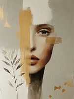 Een poëtisch portret waarin slechts een deel van het gezicht zichtbaar is — mysterieus, maar direct in contact met de kijker. De combinatie van grove penseelstreken, bladmotieven en zachte huidtonen creëert een intrigerend spel tussen abstractie en realisme. Een ode aan de kracht van het onuitgesprokene en het detail in eenvoud.