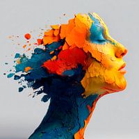 Een levendig profiel van een vrouw, afgebeeld met een gestructureerd verf oppervlak die lijken te fragmenteren en uiteen te vallen alsof ze beïnvloed zijn door beweging of emotie. De achtergrond is neutraal grijs, wat de levendige kleuren en dynamische expressie van het kunstwerk versterkt.
