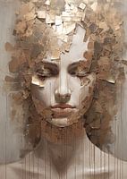 Fragmentarische portret van een vrouw, geïnspireerd op verschillende kunststijlen. Mixed media en portretkunst. Goud, beige en bruintinten in gebarsten elementen als puzzelachtige stukjes, onthullen een serene schoonheid.