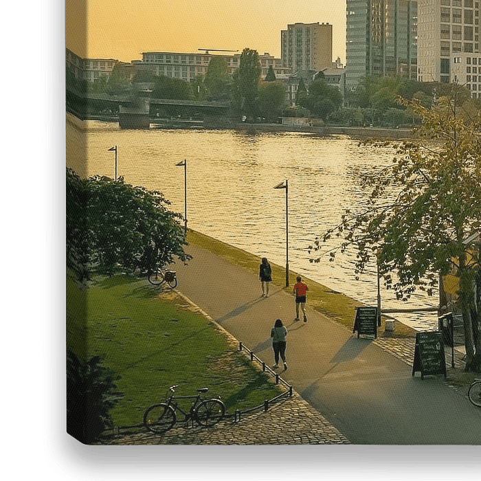 De zon gaat langzaam onder boven het bankdistrict en baadt de Main in een gouden licht.