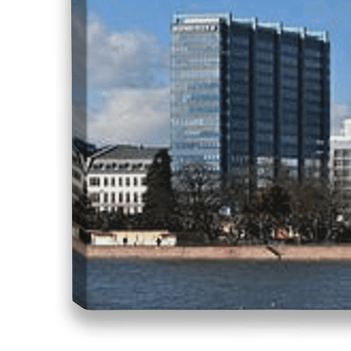 Koop de foto Frankfurt Mainufer en bankdistrict Panorama van Panorama Streetline op canvas, aluminium dibond, (ingelijste) fotoprint, behang en ArtFrame, op maat geprint in Fine-Art kwaliteit.