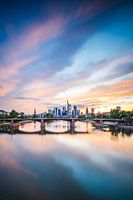 Frankfurt aan de Main met weerspiegeling van de hemel in de Mainbrug en op de achtergrond de skyline