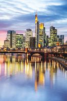 Een levendige skyline van een stad weerspiegelt in een kalme rivier tijdens de schemering, met wolkenkrabbers die oplichten onder de avondhemel. De brug op de voorgrond is verlicht, wat bijdraagt aan het betoverende stadslandschap.