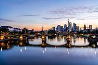 De Frankfurtse skyline bij zonsondergang met de reflectie van de lichten in het water