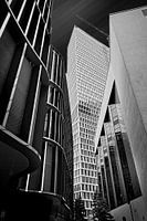 Zwart-Wit opname van het moderne centrum van de stad Frankfurt am Main.