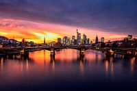 Dit prachtige uitzicht kan worden genoten in Frankfurt Duitsland vanaf de Flöserbrücke. Het toont de skyline van Frankfurt met de grote wolkenkrabbers bij zonsondergang met romantisch licht.