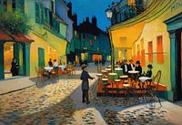 Warm gouden licht valt uit een charmant Parijs café op geplaveide straten, waar zachte schaduwen zich vermengen met de gloed van lamplicht. De impressionistische streken van de kunstenaar vermengen amber, oker en diepblauw en vangen de romantiek van een avond vol stille gesprekken en rinkelende glazen. De scène nodigt kijkers uit om te blijven hangen, om de lucht te voelen die rijk is aan warmte en de belofte van langzame, mooie nachten in het hart van Frankrijk.
