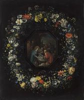 Jezus wordt aanbeden door de herders na zijn geboorte bij Kerst in een krans met bloemen tegen een donkere, zwarte achterkant.