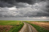 Een half verharde kustweg in het franse Normandië, in de omgeving van de plaats Arromanches-les-bains. Continu komen er dikke wolken binnendrijven van zee.