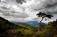 Frans landschap, Alpes-de-Haute-Provence. Bergachtig landschap met bewolkte licht en solitaire boom.......