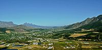 Landschap met het dorp Franschhoek in de vallei met bergen