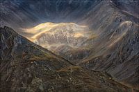 De berghellingen in de Franse Alpen kleuren rood-oranje in de herfstzon. Deze foto is gemaakt op de Col du Galibier, een pas in de Franse Alpen. Je kunt deze foto alleen maken als er veel wolken in de lucht zijn met hier en daar een opening waar de zon door kan schijnen.