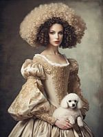 "Franse Poedel" is een artistieke viering van grandeur en gratie uit vervlogen tijden. Dit portret, dat de weelde van het baroktijdperk oproept, toont een vrouw gekleed in een weelderige jurk van goudgeborduurde stof, compleet met overdadige mouwen en een elegante halslijn. Haar houding en expressie stralen aristocratische zelfverzekerdheid uit, terwijl haar volumineuze kapsel een aura van distinctie en extravagantie toevoegt.