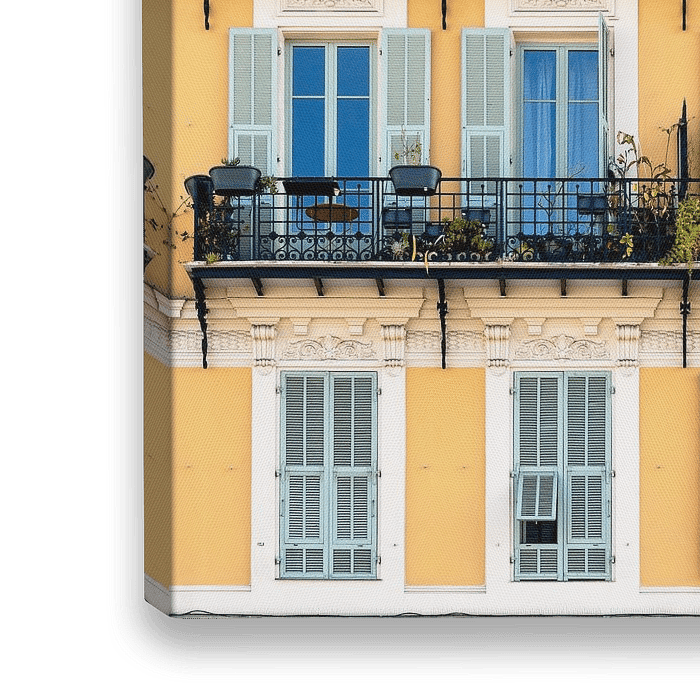 Karakteristieke Franse gevel van een groot pand in de gele kleur van het Zuiden. Met zacht blauwe Louvre luiken, sierlijke ijzeren balkons en stenen ornamenten. Bijna elk raam is net iets anders. Gefotografeerd in Nice, Zuid Frankrijk.