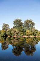 Een bomenrij gespiegeld in het strakke water van de Dordogne in Frankrijk. Ik heb altijd iets gehad met spiegeling en reflectie, en de serene rust van dit water - strak en stil in de ochtendzon van 2 september 2019 - was precies waar ik naar zocht. De bruine streep in het midden is de oever aan de overkant.