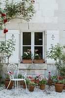 Een heerlijke plek in de schaduw in de Franse zomer. De kalkstenen muur, luiken met details bij het raam en planten om het stoeltje heen. Voor een ultiem ontspannen en zomers gevoel. Wegdromen met een briesje en een goed boek. Het kan zomaar een uitkijkje uit een raam zijn naar de tuin. Voor de schrijvers, dromers en denkers.