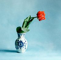 Prachtige rode Franse tulp in een mooie Delfts Blauwe vaas. Digitale bewerking met wolken en structuur.