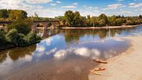 Drie kano's op de oever van de Vézère bij het dorpje Limeuil in de Franse Dordogne. Bij Limeuil komen de Vézère en de Dordogne samen. Links in het beeld nog de Vézère, de brug verderop overspant de Dordogne die da naar rechts afbuigt.
