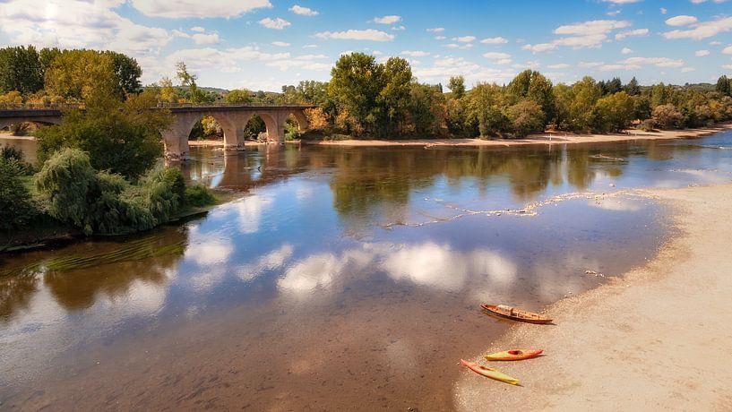 Drie kano's op de oever van de Vézère bij het dorpje Limeuil in de Franse Dordogne. Bij Limeuil komen de Vézère en de Dordogne samen. Links in het beeld nog de Vézère, de brug verderop overspant de Dordogne die da naar rechts afbuigt.